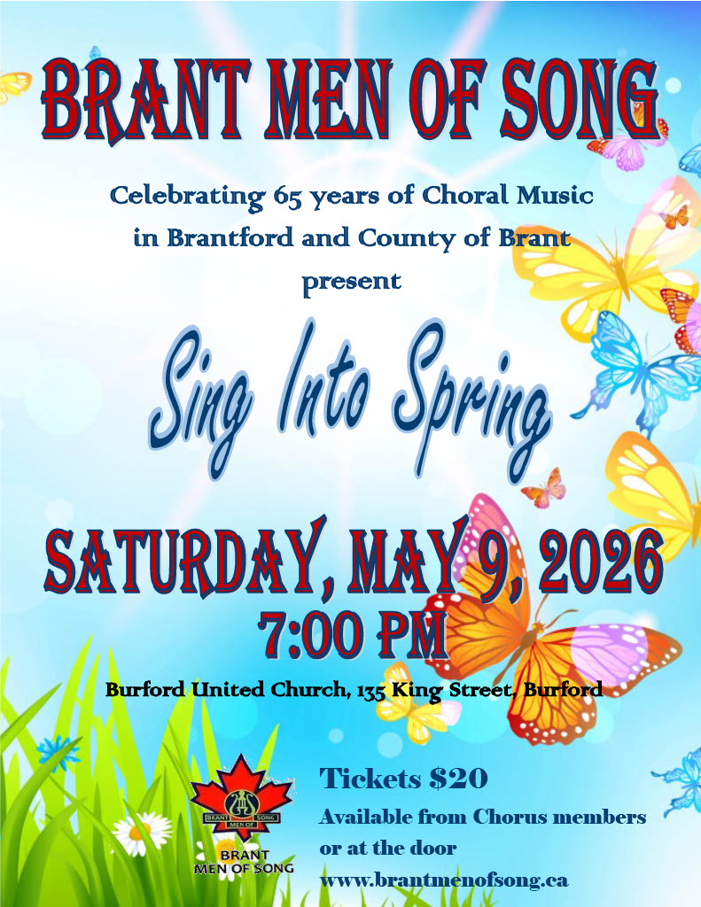 Welcome to the Brant Men of SongNext ShowApril 11, 2026 "A Day of Choral Singing" Join us for the workshop 1:00-4:30 PM, and then enjoy the free concert at 7:00 PM. RSVP to attend the workshop by filling in this form. All details are available on the Events page. Latest UpdatesBMOS has been featured in the news lately: In Other News...The men are looking to expand their numbers! Contact us for details on joining BMOS by email at: brantmenofsong@gmail.com. Any ladies interested in joining the Brant County Singers? Contact them by email at: brantcountysingers@gmail.com. Come visit us on Facebook! The Brant Men of Song are very fortunate to be supported by the City of Brantford and the County of Brant through their Community Grant Programs. |